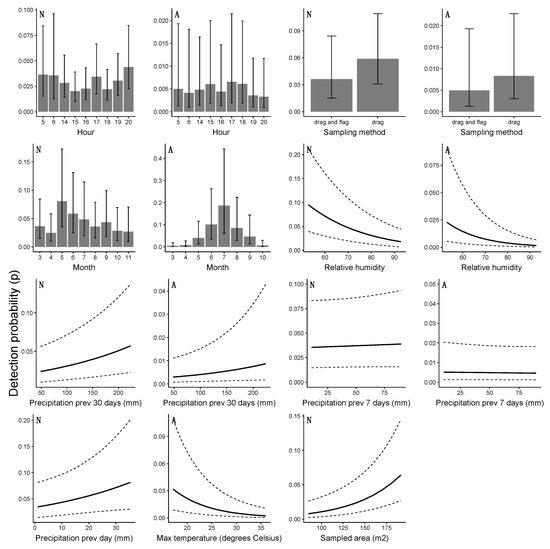 Relationships between observation-level variables and detection probability for nymphs (N) and adult ticks (A), modeled with a logit link. Dotted lines and whiskers are the 95% confidence interval.