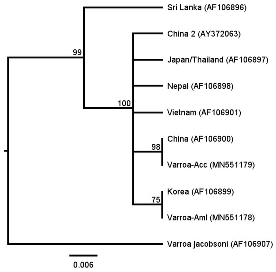 Phylogenetic analysis of CO-I gene nucleotide sequences from different Varroa destructor haplotypes. Varroa-Acc and Varroa-Aml stand for the CO-I gene sequences of Acc and Aml derived Varroa mites, respectively, and CO-I gene sequences of seven known V. destructor haplotypes and one V. jacobsoni haplotype are included (the GenBank accession number are associated). Among them, V. destructor mites of Sri Lanka, China, China 2, Nepal, and Vietnam haplotypes were sampled from A. cerana, while V. destructor mites of Korea and Japan/Thailand haplotypes were collected from both A. cerana and A. mellifera [10,15]. Bootstrap values (100 replicates) are displayed by the nodes. The genetic distance is drawn to scale. The phylogenetic analysis suggests that the Varroa mites collected in the current are either China haplotype (Acc derived) or Korea haplotype (Aml derived).