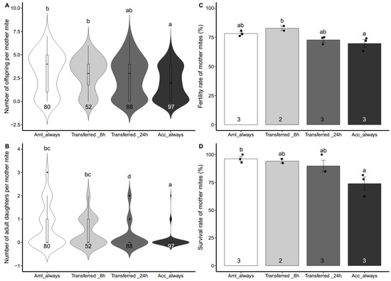 The fertility rate of mother mites presented a small, but significant difference among the four treatments (Figure 2C. one-way ANOVA, F (3, 7) = 5.360, p = 0.031). Only mites of the Transferred_8 h group had a significantly higher fertility rate than those of Acc_always (Figure 2C. Tukey HSD test, p = 0.033). The survival rates of mother mites showed a significant difference among the four treatments (Figure 2D. one-way ANOVA, F (3, 7) = 5.289, p = 0.032). post hoc comparison showed that only mites of Aml_always had a significantly higher survival rate than those of Acc_always (Figure 2D. Tukey HSD test, p = 0.032).