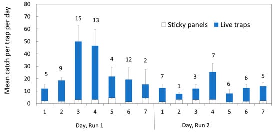 Mean daily catch per trap of adult Halyomorpha halys in alternating sticky panels and live traps, on a vineyard–forest margin at Fondazione Edmund Mach, San Michele all’Adige (TN), Italy. Error bars show one standard error (n = 6 replicates). Runs 1 and 2 were at different locations, 200 m apart. Labels indicate the mean improvement in catch from the live traps over sticky panels.
