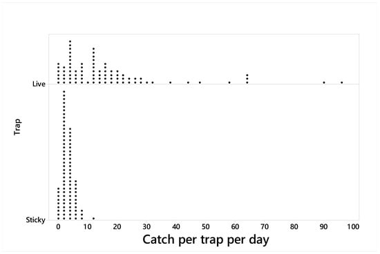 Dotplot of catch per trap per day with spatially-alternating live traps (live, upper) and sticky panels (lower) at the forest–vineyard margin in San Michele all’Adige (TN), Italy (n = 6 reps, operated daily for two runs of seven days, at 200 m spacings between runs).