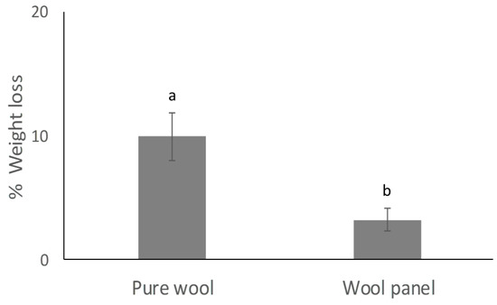 Weight loss of wool panel compared with pure wool samples exposed to clothes moth larvae for 15 days. Different letters above bars indicate significantly different means (t-test, p < 0.001).