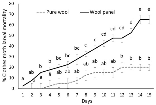 Over time mortality (mean percentage ± SE) of clothes moth larvae exposed to the commercial wool panel compared with pure wool. Different letters indicate significantly different means (ANOVA Mixed Proc., Tukey adjusted p < 0.05).