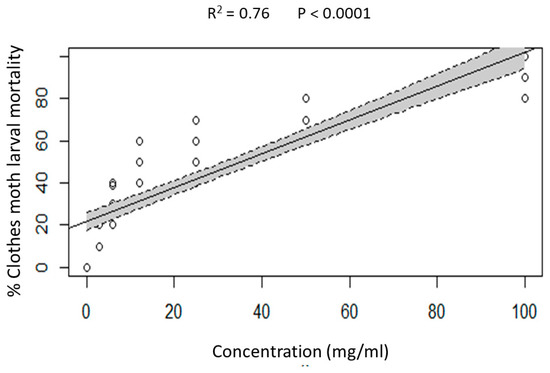 Clothes moth larvae appeared to be significantly susceptible to disodium octaborate tetrahydrate (DOT) incorporated in pure wool, and the effect was concentration dependent (Figure 4). According to the result of linear regression analysis, larval mortality was shown to be positively correlated with the concentration of DOT in pure wool (adjusted R2 = 0.7627, F = 267.7, p < 0.0001).
