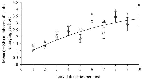 Mean (± SE) numbers of adults emerging per host with various larval densities (regression: y = −0.0166x2 + 0.435x + 0.6155; adjusted r² = 0.8127, p = 0.0001). The different letters above each larval density show significant difference among treatments at a = 0.05.