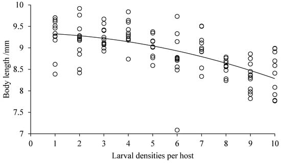 Body length of D. helophoroides adults emerging per host with various larval densities. Relationship between larval densities per host and body length width of D. helophoroides adults (y = −0.0091x2 − 0.0153x + 9.3497; adjusted r² = 0.8655, p = 0.0001).