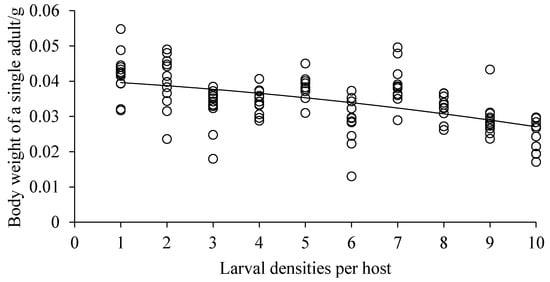 The fitness value of some traits and host exploitation patterns in parasitoids are important to understand the evolution of development strategies. For parasitic natural enemy insects, the development of the whole immature stage is completed in a single host so that host quality largely affects their developmental performance [48]. For gregarious parasitoids, when host size is fixed, larvae must compete for resources during development [49]. So, in this study, adult fitness was determined largely by the impacts of intraspecific competition on the development of D. helophoroides larvae. The result was consistent with Homotrixa alleni (Diptera: Tachinidae) larvae [36]. Life history evolution is subject to tradeoffs: when individuals benefit from a change in one life history feature, they pay a price for a corresponding change in another [50]. One of the essential questions in evolutionary ecology is to explore which life-history characteristics have tradeoffs influencing biological fitness [51]. Our results showed that there was a negative correlation between the numbers of adults emerging per host and adult body size when less than six larvae per host were introduced. It indicated that there was a tradeoff between the numbers of adults and their body size for utilizing limited host resources, as larval densities increased. However, when more than five larvae per host were introduced, there was no significant difference in the number of adults emerging per host (about three adults emerging per host or total weight of adults). The study indicated that a single host of 0.55–0.6 g can satisfy the growth and development of about five D. helophoroides larvae, and the fitness of the adults emerging per host remained unchanged. If the count was exceeded, to ensure the population quantity (mean numbers: three adults), the mean individual size of D. helophoroides larvae would be reduced. Hence, if the numbers, individual size and total weight of adults emerging per host are taken into account, we suggest that six D. helophoroides larvae per host is the most optimal.