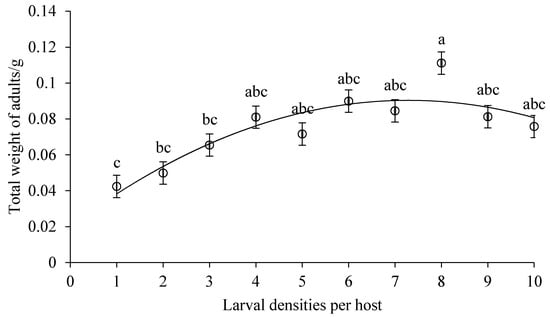 The total weight of adults emerging per host with various larval densities. Relationship between larval densities per host and the total weight of adults emerging per host (y = −0.0013x2 + 0.0192x + 0.0203; adjusted r² = 0.7874, p < 0.01). See Figure 1 legend for interpretation.