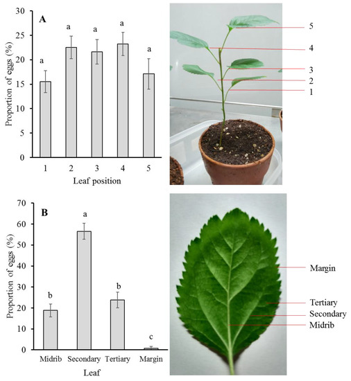 There was no significant preference of eggs laid on the different leaves of one plant (Figure 1A; F = 2.34, df = 4,85, p = 0.0619). However, female adults preferred to lay eggs (56.5 ± 3.84%) near the secondary leaf vein of a leaf (Figure 1B; F = 50.46, df = 3,65, p < 0.0001).