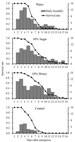 Survival curve and daily fecundity of Phyllonorycter ringoniella females supplied with water, 10% sugar, 10% honey, and nothing (control) at 25 °C.