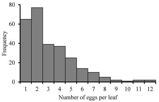 Eggs were laid singly, and mostly one to two eggs per leaf. The frequency distribution of eggs laid per leaf exhibited the positive skewed distribution pattern shown in Figure 3.