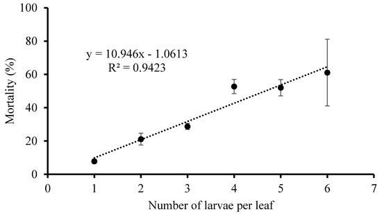 Larval mortality increased linearly (r2 = 0.94) with the number of larvae per leaf (Figure 4). The larval mortality was lower (7.8 ± 1.22%) as one larva developed per leaf, while it increased (61.1 ± 20.03%) when six larvae developed together in one leaf.