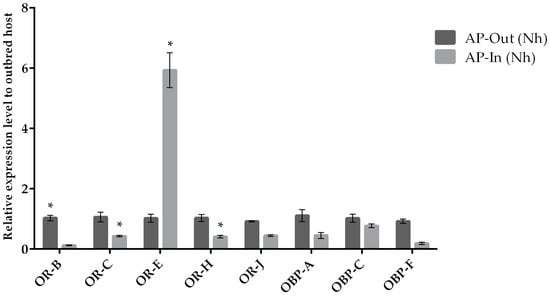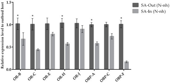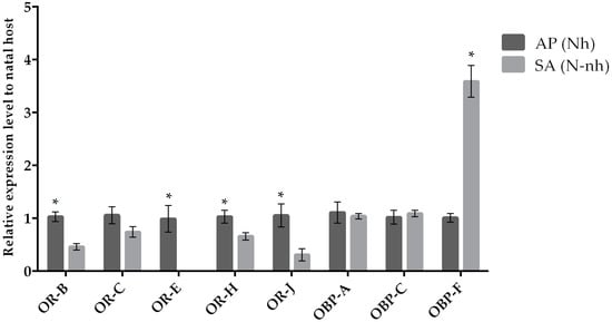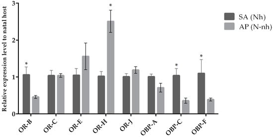 Mean (+/− SE) expression levels of ORs and OBPs from the heads of A. ervi maintained on the natal host SA (S. avenae; Nh) or on the non-natal host AP (A. pisum; N-nh) measured by RT-qPCR. RT-qPCRs were performed using specific primers for each gene. Normalizer gene: RPL19. The asterisk * above the bars indicates significant differences according to two-way ANOVA (p value < 0.05).