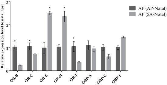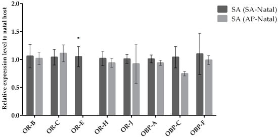 Mean (+/− SE) mRNA expression levels of ORs and OBPs from the heads of A. ervi maintained on the natal host A. pisum (AP-Natal) or switched from S. avenae to the non-natal host A. pisum (SA-Natal) measured by RT-qPCR. RT-qPCRs were performed using specific primers for each gene. Normalizer gene: RPL19. The asterisk * above the bars indicates significant differences according to two-way ANOVA (p value < 0.05).