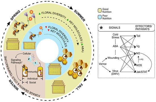 Schematic summary illustrating the relevance of nutrition during spring, summer and fall for colony growth before entering winter, which is characterized by forage dearth and cold temperatures. A good nutrition (green area of the diagram) is based upon the great diversity of floral resources and the availability of key molecules, like for example abscisic acid (ABA). In contrast, the lack of floral diversity combined with reduced amounts of key molecules leads to a poor nutrition (blue). Differences in nutrition lead to dissimilar levels of colony growth (represented visually in the figure as the different number of honeycombs). These colony-level variations in bee population lead to different capabilities to mount a socially-based immune response to confront winter-associated stresses. During winter, the immune strength of the colony is based in the interaction between social and individual immunity. Once any or all of these stresses escape the social level of defenses, the signal is captured, transduced and amplified by activated hemocytes (cellular) through the main signaling pathways reviewed here in association with Varroa, virus (deformed wing virus, DWV) and cold (Janus kinases/signal transducer and activator of transcription proteins (JAK/STAT) and Toll). The interaction between signals and effector pathways is illustrated in the right side of the main figure. In this model, nitric oxide (NO) represents a key molecule playing a role within the cross-talk between the responses triggered by Varroa (viruses and wounding) and cold. At the same time, ABA is proposed as a cytokine playing a priming effect over those responses, exerting its role through NO production activation. At the start of the foraging season (spring in the diagram), the post winter colonies may also differ in the number of forager bees able to start the cycle again when the blooming periods arrive.
