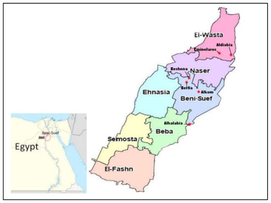Map of the study area within Beni-Suef province, Egypt. Red dots indicate tick collection sites.