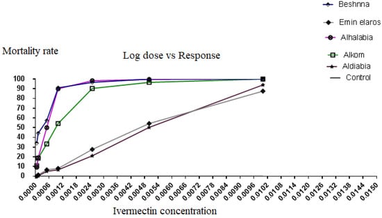 The mortality rate of larvae treated with different concentrations of ivermectin in the surveyed areas.
