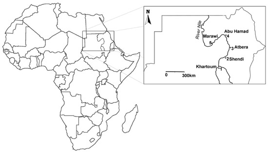 Adult workers were collected from four A. florea colonies each at five locations starting from Khartoum (1) northward along the river Nile via Shendi (2), Adbera (3), Abu Hamad (4), and up to Marawi (5), 753 km away from Khartoum (Figure 1, coordinates in Table 1). Twenty-four workers were taken from each colony for DNA analyses. DNA was extracted from the hind leg using the Chelex® (BioRad, Munich, Germany) method [41] and amplified with polymerase chain reactions (PCRs) using the protocol of Kraus et al. [42] with three already known microsatellite DNA loci—A76, A88, A107 [43,44]—and two additional loci—BI47 and AP19—both of which were used for the first time in A. florea. The queen and siring drone genotypes were determined from the worker genotypes using Mendelian inference as described by Moritz et al. [40].