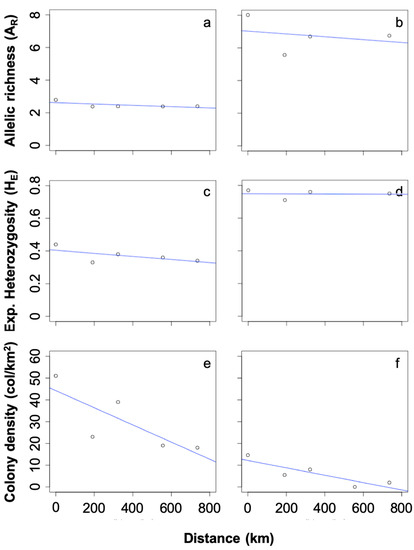 The decline of allelic richness (a,b), expected heterozygosity (c,d), and population density (e,f) from Khartoum (0 km) to Marawi (735.81 km) of both A. florea (left; a,c,e) and A. mellifera (right; b,d,f) along the river Nile.