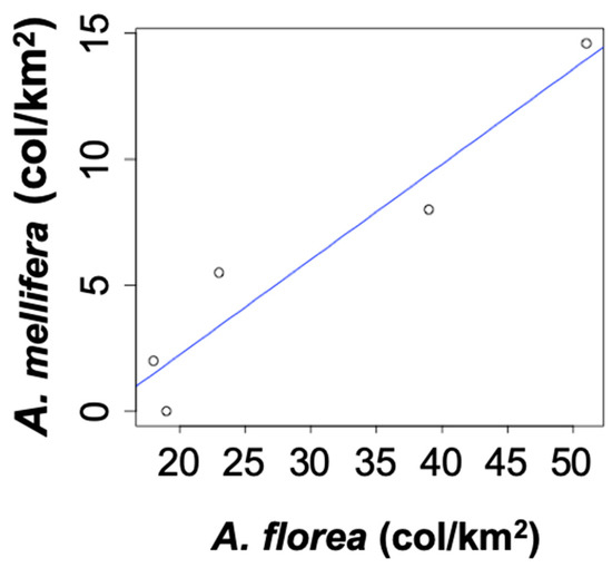 Population densities were calculated based on the number of colonies detected and the mating flight range as in Moritz et al. [40] for A. mellifera. We estimated the population densities of A. florea in the same way since drone mating flight durations and queen mating flight times are similar in both species [48,49,50].