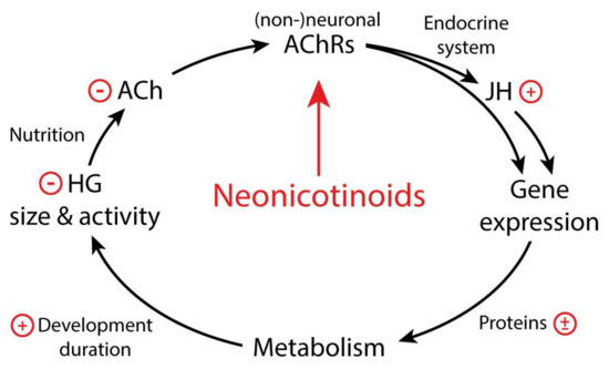 Metabolic and endocrine functions of acetylcholine (ACh) in honeybee adults and larvae and its disturbances by cholinergic pesticides, such as neonicotinoids. Impairments of neuronal or non-neuronal acetylcholine receptors (AChRs) of honeybees by neonicotinoids have been shown to increase (+) development duration of larvae and adults while reducing (−) hypopharyngeal gland (HG) size and its ACh secretion. This is likely to be a consequence of impaired energy and carbohydrate metabolism, preceded by up- or downregulation (±; via gene expression) of involved proteins, altering lipid, glucose, and glycogen metabolism. Therefore, ACh may directly or indirectly affect the endocrine system, as increased juvenile hormone (JH) titers result in developmental delays (see text for further details).