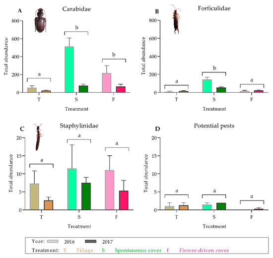 Effects of soil management on the total abundance of the predator families on the ground: (A) Carabidae; (B) Forficulidae; (C) Staphylinidae; and (D) potential grapevine pests on the ground. Values are mean (± standard error). The left bar of each couplet represents data in 2016, and the right bar represents data in 2017. Different letters indicate significant differences between the treatments, by two-way ANOVA and a Tukey’s HSD test (α = 0.05).
