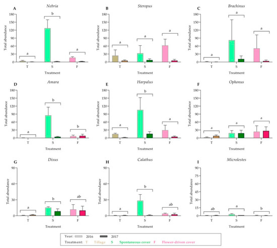 Carabidae genera captured on the ground: (A) Nebria; (B) Steropus; (C) Brachinus; (D) Amara; (E) Harpalus; (F) Ophonus; (G) Dixus; (H) Calathus; and (I) Microlestes. Values are mean (± standard error). The left bar of each couplet represents data in 2016, and the right bar represents data in 2017. Different letters indicate significant differences between the treatments, by two-way ANOVA and a Tukey’s HSD test (α = 0.05).