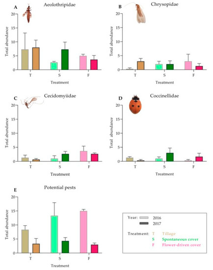 Effect of soil management on the total abundance of the predator families in the canopy: (A) Aeolothripidae; (B) Chrysopidae; (C) Cecidomyiidae; (D) Coccinellidae; and (E) potential grapevine pests in the grapevine canopy. Values are mean (± standard error). The left bar of each couplet represents data in 2016, and the right bar represents data in 2017.