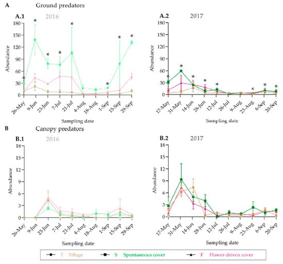 Population dynamics of predators on the ground (A) and in the grapevine canopy (B). An asterisk indicates significant differences between treatments, by ANOVA and Tukey-HSD test (α = 0.05).