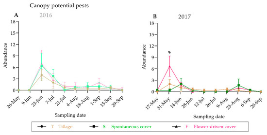 Population dynamics of potential grapevine pests in the grapevine canopy in 2016 (A) and 2017 (B). An asterisk indicates significant differences between treatments, by ANOVA and Tukey-HSD test (α = 0.05).
