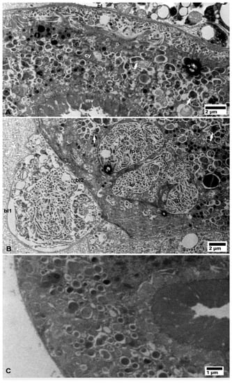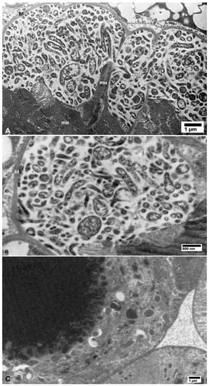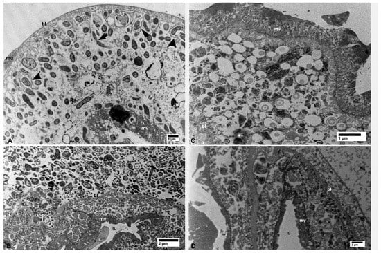 Figure 4. Bacterial cells in the Malpighian tubules of CLas-infected (A,B) D. citri. (A) Aggregates of bacterial cells under the basal lamina (bl) and in small pockets in the cytoplasm (cy). (B) Bacterial cell aggregations between the two layers of the basal lamina (bl1, bl2) as well as within large pockets (lp) in the cytoplasm. Arrows indicate putative bacterial multiplication sites(also shown below in other organs at higher magnifications). No bacterial cells aggregates were found in similar tissues from healthy control psyllids (C). Other abbreviations: mv—microvilli; bl—basal lamina; and cy—cytoplasm. (AC: non-osmicated tissues).