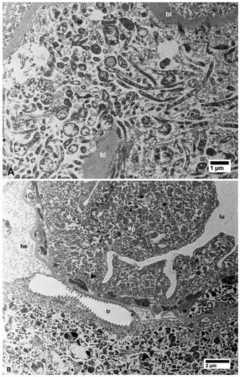 Figure 3. (A) Details of bacterial aggregates outside the midgut within the filter chamber of CLas-infected D. citri. (B) Aggregates of bacteria inside epithelial cells (ep) of the hindgut and outside the hindgut basal lamina (bl) in CLas-infected D. citri. Abbreviations—bl, basal lamina; ep—epithelial cells of the hindgut; he—hemocele; lu—hindgut lumen; tr—trachea. (A and B: non-osmicated tissues).