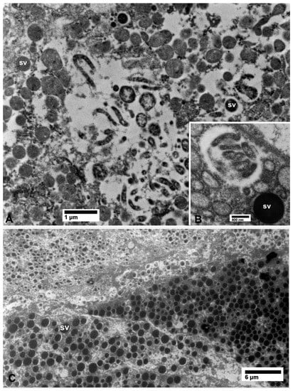 Figure 5. Bacterial cells in the secretory (acinar) cells of the salivary glands of CLas-infected (A,B) D. citri. No bacterial cells were found in similar tissues from healthy control psyllids (C) sv, which are the secretory vesicles in the salivary gland cells. (A,C: non-osmicated tissue, B: osmicated).