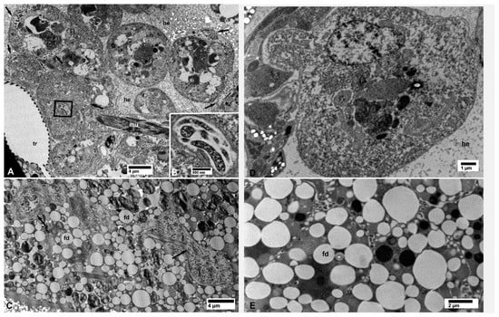 Figure 6. Bacterial cells inside hemocytes within the hemocele (A,B), and in fat cells (C) of CLas-infected (AC) D. citri. (B) shows a higher magnification of the boxed area in (A); arrows in (C) indicate small pockets of bacteria in fat cell. No bacterial cells were found in the hemocytes (D) and the fat cells (E) from healthy control psyllids. Abbreviations: fd—fat droplets; he—hemocele; mu—muscle fibers; and tr—trachea. (AE, non-osmicated tissues).