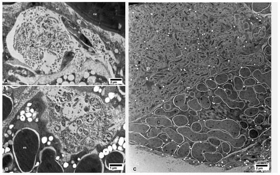 In several tissues from the CLas-exposed ACP, non-membrane bound intracytoplasmic vacuolated areas, distinct from the above-described bacteria-containing ones, enclosed closely packed bacterial cells that are usually associated with electron-dense granular matrix (gm in Figure 10A,B) as well as loosely arranged rough endoplasmic reticulum (RER, arrows in Figure 10A,B). These structures were found in CLas-exposed ACP colonies from both Lake Alfred (Figure 4) and Fort Pierce (Figure 10). We hypothesized that these intracytoplasmic inclusions were multiplication sites of the CLas bacterium (see further details in the discussion). These putative multiplication sites were found in the epithelial cells of the midgut (Figure 10A,B), Malpighian tubules (Figure 4), salivary gland secretory cells (Figure 5B and Figure 10D), and in fat cells (Figure 10C). These putative multiplication sites, as well as the other intracytoplasmic CLas-containing inclusions described above, were found only in CLas-exposed ACP adults (Figure 2, Figure 3, Figure 4, Figure 5, Figure 6, Figure 7, Figure 8, Figure 9 and Figure 10), but not in the non-exposed healthy control ones (Figure 2, Figure 3, Figure 4, Figure 5, Figure 6, Figure 7, Figure 8 and Figure 9 and Figure 11).