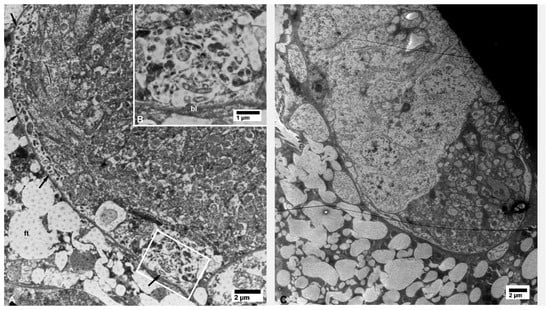 Large or small aggregates of CLas cells were also found in the vacuolated areas in the cytoplasm of secretory cells of the salivary glands in the CLas-exposed psyllids (Figure 5A,B), in hemocytes within the haemocoele (arrows in Figure 6A), in fat cells (arrows in Figure 6C), and in epidermal cells under the cuticle of many structures including a leg (Figure 7A). Aggregates of the CLas cells were found within cells of the bacteriome, adjacent to other (much larger) bacterial symbionts (‘es’ in Figure 7B). In CLas-exposed female psyllids, large aggregates of CLas cells were found under the basal lamina of the muscles surrounding the spermatheca (Figure 8A) and in the oviduct epithelial wall (Figure 8B). In neural tissues of CLas-exposed ACP, small aggregates of CLas cells were found under the basal lamina of large nerves (Figure 9A,B) close to the compound ganglionic mass, which is located in the thorax under the salivary glands.