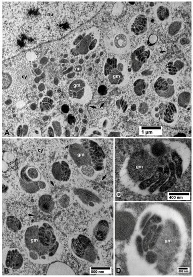 Figure 10. Putative CLas multiplication sites containing electron-dense granular matrix (gm) and closely packed bacterial cells, within vacuolated areas in the cytoplasm, in the vicinity of rough endoplasmic reticulum (arrows), in epithelial cells of the midgut (A,B), fat tissue (C), and the salivary gland (D) in CLas-exposed D. citri. Abbreviations: cy—cytoplasm; gm—granular matrix; mi—mitochondria; and nu—nucleus. (AD: osmicated tissues).