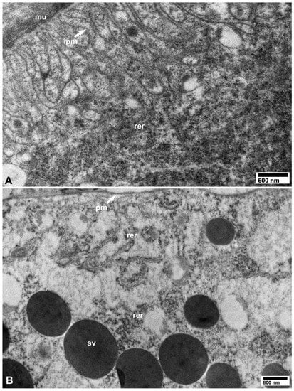 Figure 11. TEM images from healthy control D. citri adults (unexposed to CLas). (A) Basal part of a midgut epithelial cell, showing surrounding muscle fibers (mu), infoldings of the basal plasma membrane (ipm), and rough endoplasmic reticulum (rer). (B) Part of a secretory cell in the salivary gland showing plasma membrane (pm), secretory vesicles (sv), and rough endoplasmic reticulum (rer). (A,B: osmicated tissues).