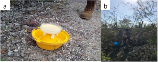 (a) Modified McPhail trap with bacterial bait (trap cover not shown) and (b) traps positioned at El Barranco area (Santa Cruz Island, Galapagos). The traps were observed for flies/insects after a trapping night. Concurrently, consortia of bacteria and yeasts from isolation plates were collected for identification using next generation amplicon sequencing.