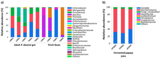 Composition of bacterial (a) and fungal (b) consortia acquired from adult P. downsi gut or finch feces. Consortia were used in traps and as stimuli (LAB05; YPDM1) in the PER experiment. Color codes of bacterial and fungal genera with relative abundance of >0.1(%) are listed in the right-side panels. LAB01-05: Lysogeny agar, TAB01-04: Tomato agar, and YPDM1-3: Yeast-extract potato dextrose media.