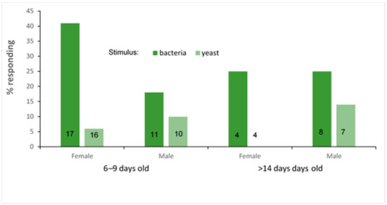 Proboscis extension response of P. downsi to bacterial or yeast stimuli. Flies 6–9 days old were derived from field-collected pupae recovered from naturally-infested nests. Flies >14 days old were trapped as adults in the field and maintained in the laboratory prior to testing. The difference in the response is highly significant (GLM effect test x2 = 5.96, p = 0.014). Numbers within columns denote sample size (note that none of the four older females responded to yeast).