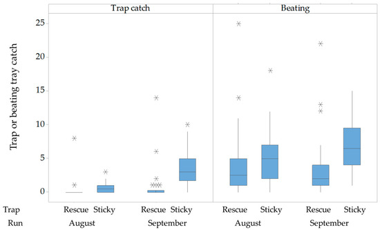 Experiment 2. A full factor analysis of variance (ANOVA) was carried out on the factor’s trap type (sticky or Rescue), method of capture (trap or beating), and period of sampling (run 1 or run 2) for the response variable catch, which was log-transformed to meet the assumptions of normality (and homogeneity). Boxplots show the median and quartiles with whiskers for adjacent values that are the lowest and highest observations that are still inside the region defined by the following limits: lower Limit: Q1 − 1.5 (Q3−Q1), Upper Limit: Q3 + 1.5 (Q3−Q1).