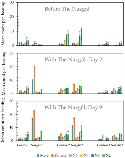 Mean counts of Halyomorpha halys by mobile life stage and treatment after beating foliage for two-people-minutes in the three hedgerow transects in apple orchards near Rovereto, Italy. Upper: before the establishment of The Nazgȗl traps, and Lower: Days 2 and 9 after The Nazgȗl were placed at 10 m spacings at three sites (1, n = 9 Nazgȗl; 2, n = 6 Nazgȗl; and 3, n = 5 Nazgȗl). Nazgȗl consist of long-lasting insecticide netting (1.5 × 2 m) and high-loading aggregation pheromone lures, attractive to adults and nymphs (N2–N5). Error bars show standard errors.
