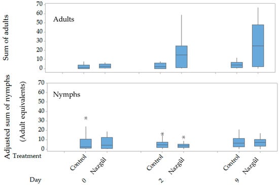 Boxplots of counts of adult (top) and adjusted counts of nymphs (bottom) Halyomorpha halys, sampled by beating foliage for two-people-minutes. Nymph counts were adjusted for stage-specific survivorship to adult [41], and instar counts summed to yield adult equivalents, before and 2 or 9 days after the establishment of Nazgȗl traps at 10 m spacings at three apple orchards near Rovereto, Italy. The asterisks are outliers at least 1.5 times the interquartile range (Q3–Q1).