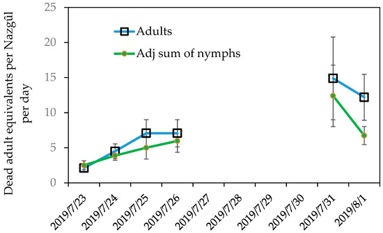 Mean daily counts of dead adults and adjusted sum of dead nymphs after raw counts per instar were converted to adult equivalent Halyomorpha halys collected in Nazgȗl trays (n = 20, y = 1.9549 × −85362, r² = 0.7555). Nymph counts were adjusted for stage-specific survivorship to adult [41] and summed across pre-adult stages to yield total adult equivalents. Error bars show standard errors.