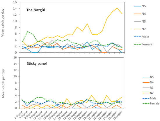 A three-week snapshot of daily phenology of Halyomorpha halys recorded using two trapping methods, The Nazgȗl trap (upper) or sticky panels (lower), baited with aggregation pheromone at a vineyard–forest margin in San Michele all’Adige (TN), Italy (5–26 August 2019).