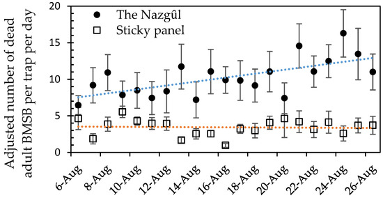 All mobile life stages were converted to adjusted adults for both trap types, and there was a 2.6-fold higher catch of adjusted adults in The Nazgȗl (up to a mean of 15 BMSB killed per day, Figure 7, or about half the rate seen in Experiment 3). Data for the prototype Nazgȗl (Figure 1) indicated a mean of 52 BMSB killed per day over 52 days (see Graphical Abstract). After the first 3 days, there was no strong surge in the catch over time in this experiment, but an upward trend remained. The numbers of adjusted adults did not reach as high as at the hedgerow and apple orchard sites further south. Catches of adult BMSB in The Nazgȗl or sticky panels were the same in the first 24 h, but the standard errors in the catch of adults and nymphs did not overlap between The Nazgȗl and the sticky panels on the majority of dates, thereafter. The ANOVA for treatment was significant (Table S3).