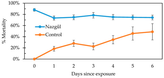 The mortality of adult BMSB removed from The Nazgȗl in the field to the laboratory was consistent over six days, after a slight reduction (−15%) in mean mortality for the BMSB previously-exposed to insecticide in The Nazgȗl trap (Figure 8), due to recovery from knock-down (Figure 8). There was a mean increase in mortality of untreated control BMSB in 24 h (18%). Taken together with the mortality seen in the untreated control, this suggests a slight bias towards survival and recovery for a low proportion of the poisoned BMSB, up to about 25% after 24 h (Schneider–Orelli formula).