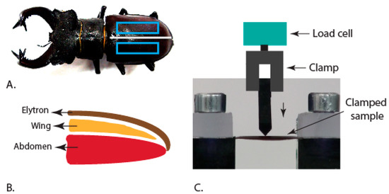 - Lomakin, J.; Huber, P.A.; Eichler, C.; Arakane, Y.; Kramer, K.J.; Beeman, R.W.; Kanost, M.R.; Gehrke, S.H. Mechanical properties of the beetle elytron, a biological composite material. Biomacromolecules 2011, 12, 321–335. [Google Scholar] [CrossRef]