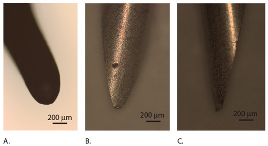 | Tip Diameter (µm) Measured at 100 µm from the Tip | Average Puncture Force (N) | Puncture Pressure (kPa) | |